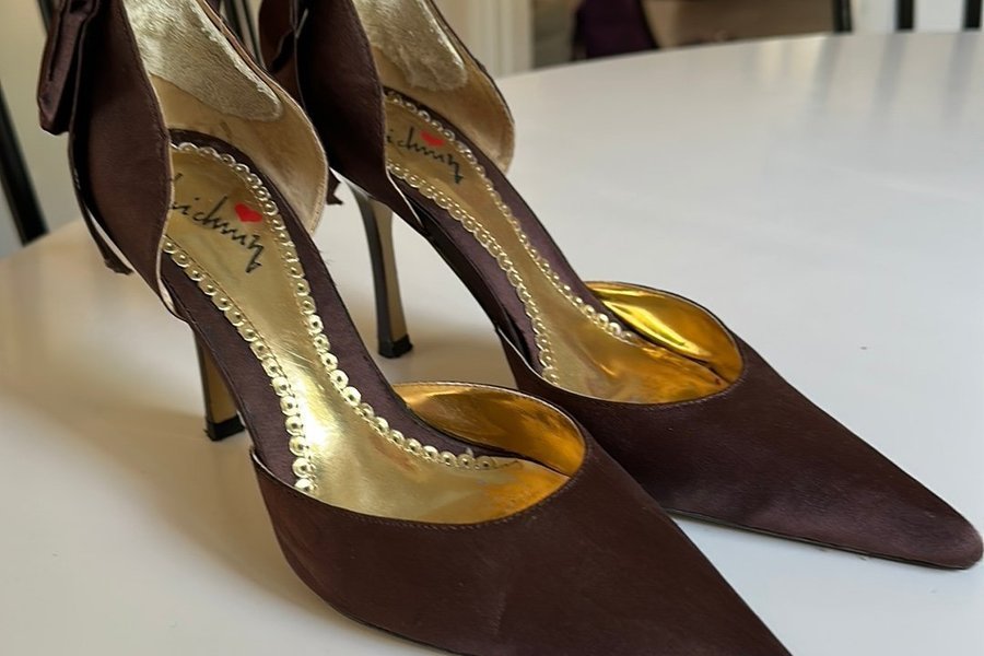 Säljer mina bröllopspumps. Eleganta, unika bruna pumps med spetsig tå och dekorativ rosett baktill. Guldfärgad insida och detaljer. Använda en dag. Inköpta från USA. Stl.37