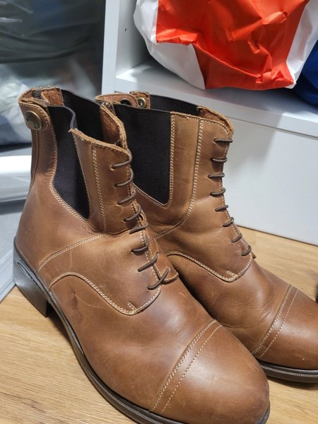 Ett par bruna kängor med snörning framtill och resår i sidorna. Skorna har en klassisk design med rundad tå och en låg klack. De är i gott skick och passar bra för vardagsbruk.