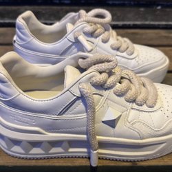 Röda ballerinaskor med snörning. Skorna har en rundad tå och en platt sula. Snörningen är i kontrasterande färger, orange och limegrön, och knyts över foten. Insidan av skorna är i en ljusare rosa nyans.