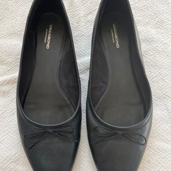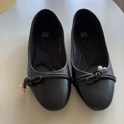 Ett par svarta ballerinaskor med en liten rosett framtill. Skorna har en platt sula och är lätta att ta på och av. De är lämpliga för vardagsbruk.