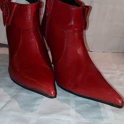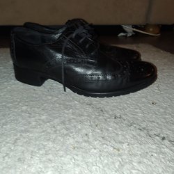 Ett par svarta pumps med en elegant design. Skorna har en spetsig tå och en utskuren detalj på sidorna. Klacken är medelhög och stabil. Insidan är ljus med en etikett som anger "Made in Italy". Yttersulan är i läder och visar storleken 37.5.