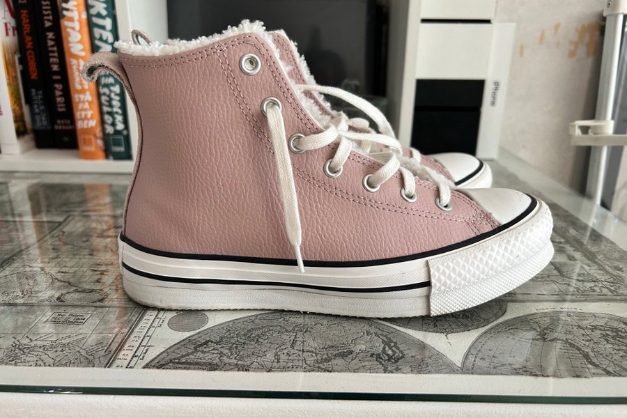 Rosa skinn-Converse med vit snörning och vit sula. Skorna är lätt fodrade vilket passar bra till lite kyligare dagar/kvällar.