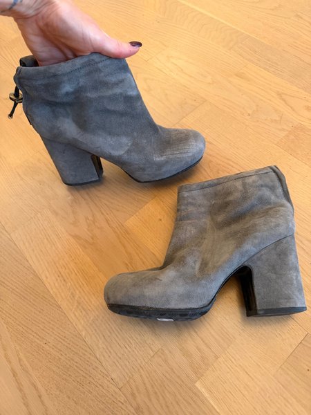 Ett par grå ankelboots med hög klack. Perfekt för både vardag och fest.