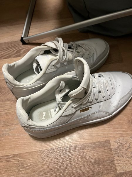 Ett par vita sneakers från Puma. Skorna har vita skosnören och en diskret logotyp i guld på sidan. De har en klassisk design med en perforerad tåhätta och en vadderad krage för komfort.