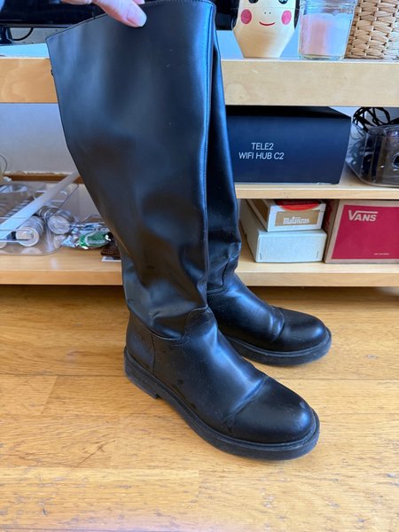 Ett par svarta stövlar med en robust sula. Stövlarna är höga och når upp till knäet. De har en slät yta och är i gott skick.