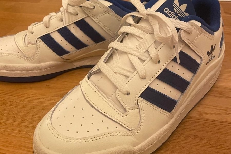 Sælger et par klassiske Adidas Forum Low sneakers. Skoene har de ikoniske tre striber i en flot blå farve, der står i god kontrast til den hvide baggrund. Perfekt til hverdagsbrug eller som et stilfuldt element i din garderobe.