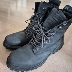 Ett par svarta kängor från Ecco. Skorna har blåsvarta snören och en robust sula. De är designade för att ge bra stöd och komfort. Gore tex