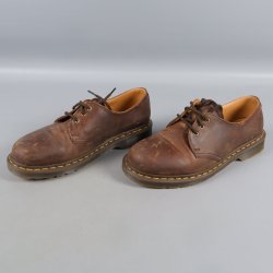 Ett par lågskor från Dr. Martens i brunt läder. Skorna har gula sömmar runt sulan och gula skosnören. Sulan är mönstrad för bra grepp.