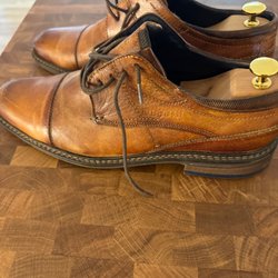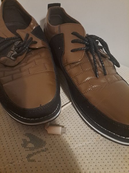 Ett par bruna lågskor med svarta detaljer och snörning. Skorna har en vit rand längs sulan.