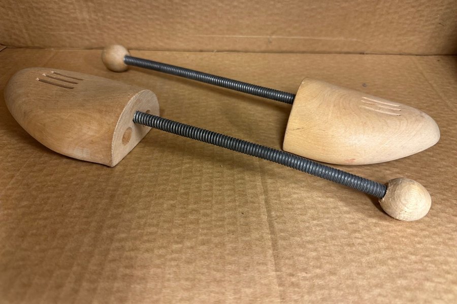Ett par skoblock i trä med spiralfjäder för att bibehålla formen på dina skor. Skoblocken är justerbara i längd för att passa olika skostorlekar.