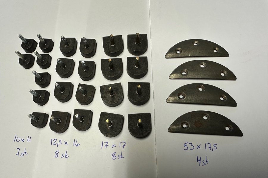 Ett sortiment av klackar och skydd i olika storlekar. Innehåller klackar med måtten 10x11 (7 st), 12,5x16 (8 st), 17x17 (8 st) samt skydd med måtten 53x17,5 (4 st). Perfekt för reparation eller utbyte.