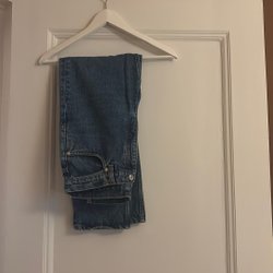 Blåa jeans från arket i rak modell, har även klippt en egen slits längst ner på ytterkanten på båda sidorna. Nästan nyskick, ej använt så mycket.