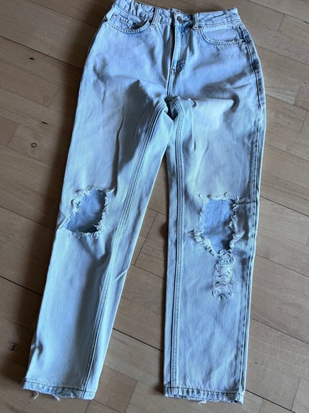Lyseblå jeans med huller på begge knæ og slidte detaljer forneden. Bukserne har lige ben.