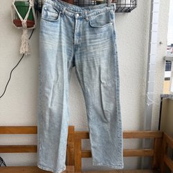 Blåa jeans från arket i rak modell, har även klippt en egen slits längst ner på ytterkanten på båda sidorna. Nästan nyskick, ej använt så mycket.