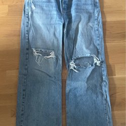 Trendiga ljusblå jeans från Pull&Bear med vida ben och slitna detaljer vid knäna. Byxorna har en avslappnad passform och råa kanter nedtill. Hade klippts till 100 cm hög. Storlek 32.