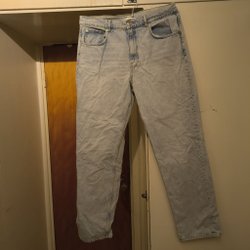Ljusa jeans med hög midja och avsmalnande ben. Jeansen har fickor fram och bak. Det finns en liten fläck på vänster ben och en liten fläck på bakfickan.
