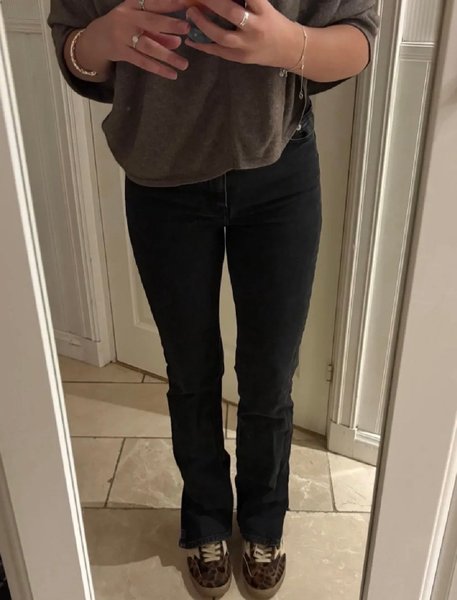 Svart gråa bootcut jeans från Gina tricot medelhög midja med en slits nedtill. Säljer dessa då jag har dubbelt.