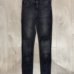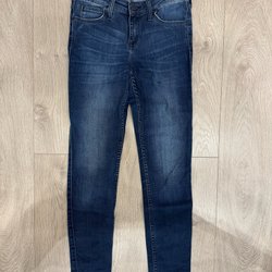 Ett par unika blåa Lee jeans med dragkedja vid bensluten och en reva/hål vid ena knät.