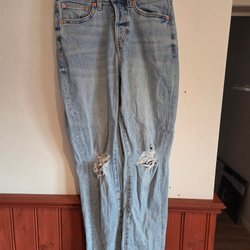 Ljusa jeans med vida ben och slitna detaljer vid knäna. Klassisk femficksmodell.
