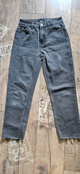 Ett par gråsvarta jeans med hög midja.