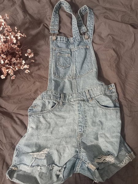 Blå denim-overallshorts med justerbara axelband och fickor fram och bak. Shortsen har en avslappnad passform och slitna detaljer.