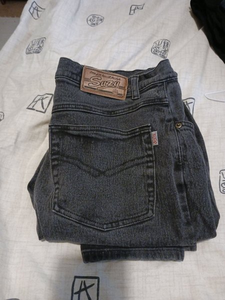Ett par gråa jeans med fickor bak och fram. Jeansen har en Suzu-etikett på baksidan.
