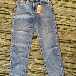 Ett par blå jeans med en avsmalnande passform. Jeansen har en klassisk design med fickor fram och bak.