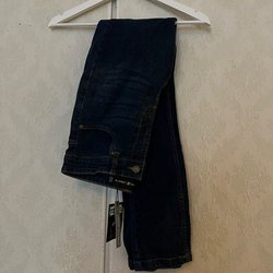 Ett par mörkblå jeans med klassisk design. Jeansen har fickor fram och bak.