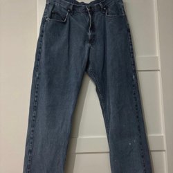 Ett par ljusblå jeans från Wrangler. Jeansen har en avslappnad passform och en klassisk design. Observera slitaget på bensluten.
