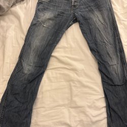 Normalt slitage. Givetvis noggrant tvättade, men de kommer från ett hem med djur, så har jag nämnt det. Midja 110 cm och innerbenslängd 77 cm.