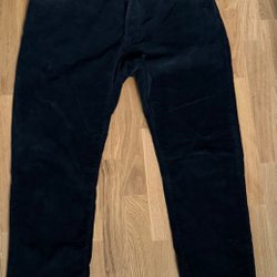 Ett par mörkblå jeans med klassisk design. Jeansen har fickor både fram och bak, samt detaljerade sömmar. På insidan finns en etikett med text och tvättråd.