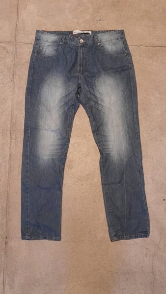 Ett par blå jeans med fickor fram och bak. Byxorna har en ljusare tvätt på framsidan av låren.