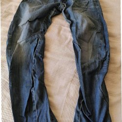 Ett par blåa jeans med fickor bak och fram. Jeansen har en extra ficka på sidan av benet.