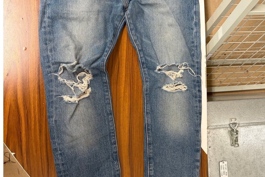 Jeans i ljusare tvätt med slitningar på knäna. Byxorna har en klassisk modell med raka ben och knappgylf.