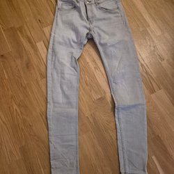 Ett par jeans med normalhög midja och raka ben. Jeansen har fickor fram och bak samt hällor för bälte. Gylfen stängs med dragkedja och knapp.