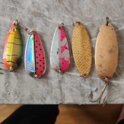 En samling av fem olika fiskebeten i varierande färger och mönster. Betena inkluderar både traditionella och moderna design, vilket kan passa olika fisketekniker. Perfekt för den som vill utöka sin utrustning.