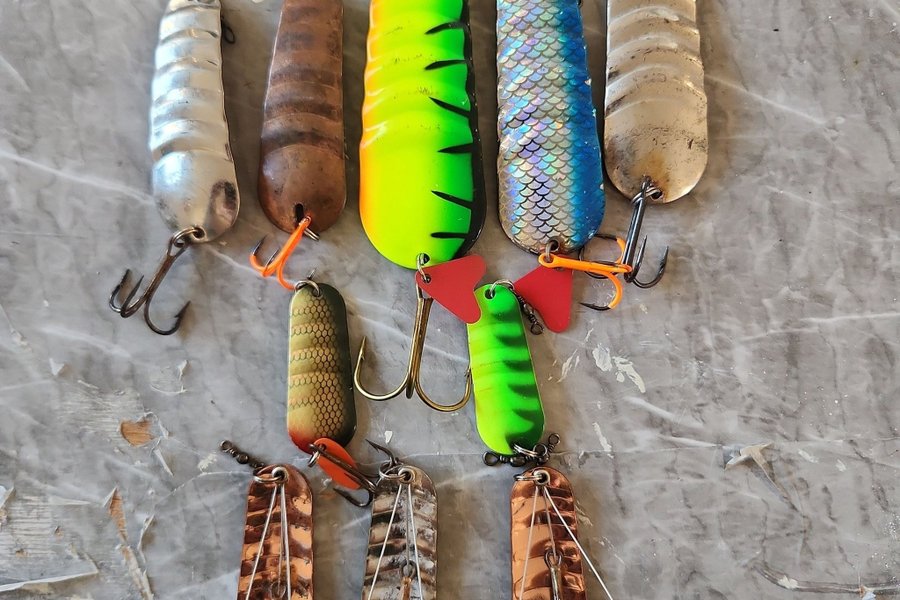 Samling av 10 olika fiskedrag i varierande färger och mönster. Inkluderar både större och mindre drag, lämpliga för olika typer av fiske. Perfekt för den som vill utöka sin utrustning.