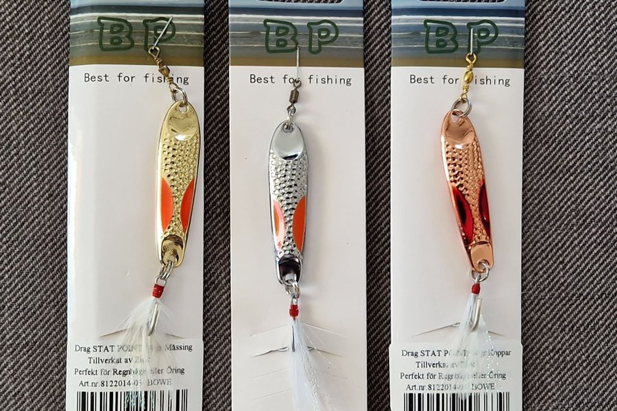 Tre olika fiskespön som kan användas för fiske. Varje spö har en unik färg och design, vilket kan vara användbart för att locka olika typer av fisk. Perfekt för både nybörjare och erfarna fiskare.
