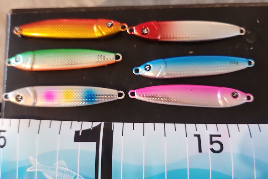 Detta set innehåller sex olika fiskedrag, var och en väger 20 gram. Dragens färger och design kan vara användbara för olika fiskesituationer. Passar för både söt- och saltvattenfiske.