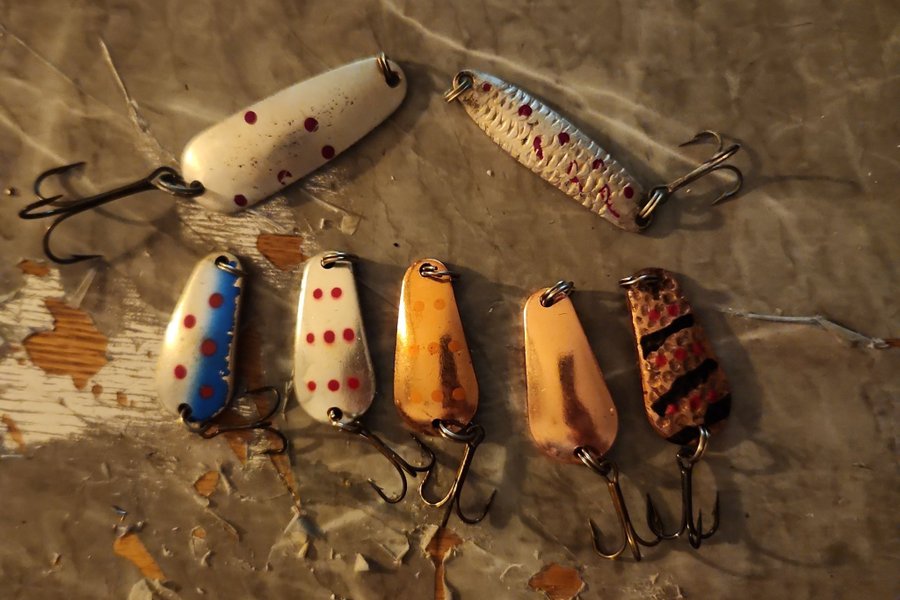 Ett urval av 7 fiskedrag i olika färger och mönster. Passar för fiske i sjöar och åar. Se bilder för detaljer.