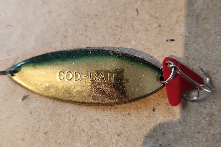 Ett gäddbete med en metallisk yta och krok. Passar för fiske efter gädda. Färgen är grön och guld.