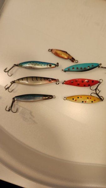 Ett urval av åtta fiskedrag i olika färger och mönster. Passar för olika fiskeformer. Se bilder för detaljer.