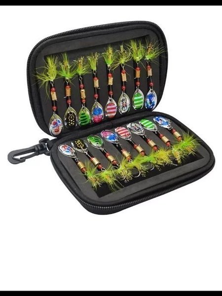 Set med flera färgglada drag för fiske, förpackade i en praktisk och hållbar förvaringsväska. Dragens design inkluderar olika mönster och färger, vilket gör dem lämpliga för olika fiskeformer. Väskan har en zip-funktion och är lätt att ta med sig.