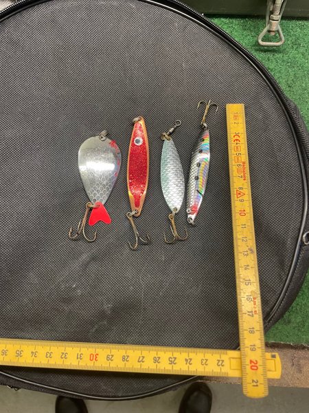Fyra olika fiskedrag i varierande storlekar och färger. Inkluderar en röd och silverfärgad drag samt en med mönster. Längd kan kontrolleras med måttbandet på bilden.