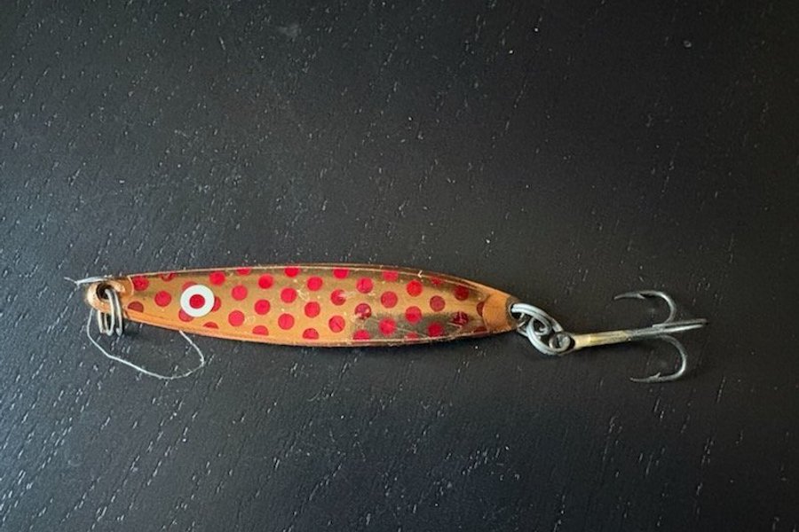 Ett fiskbete med en lång form och röda prickar. . Passar för olika typer av fiske.