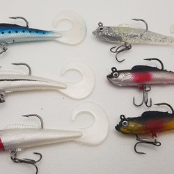 Set med rosa fiskedrag, inklusive en praktisk förvaringslåda. Perfekt för fiskeentusiaster som söker efter effektiva beten.
