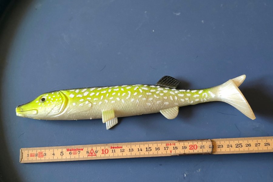 En gummifisk designad som en gädda. Den har detaljerad färg och form som efterliknar en riktig fisk. Längd: cirka 25 cm.