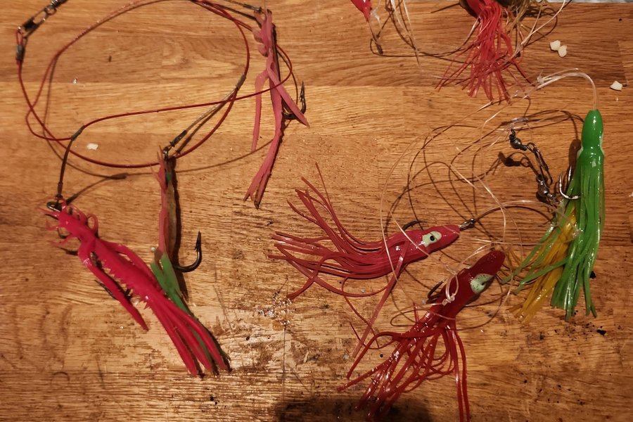 Ett urval av fiskedrag och beten i olika färger och former. Passar för fiske i både söt- och saltvatten. Inkluderar flera olika typer av drag för olika fiskemetoder.