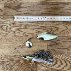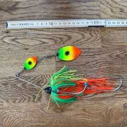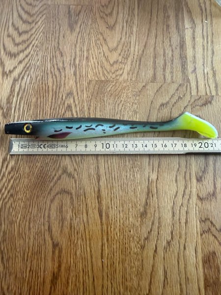 Fiskedrag av plast med en längd på cirka 20 cm. Färgen är i någon form av gäddfärg.