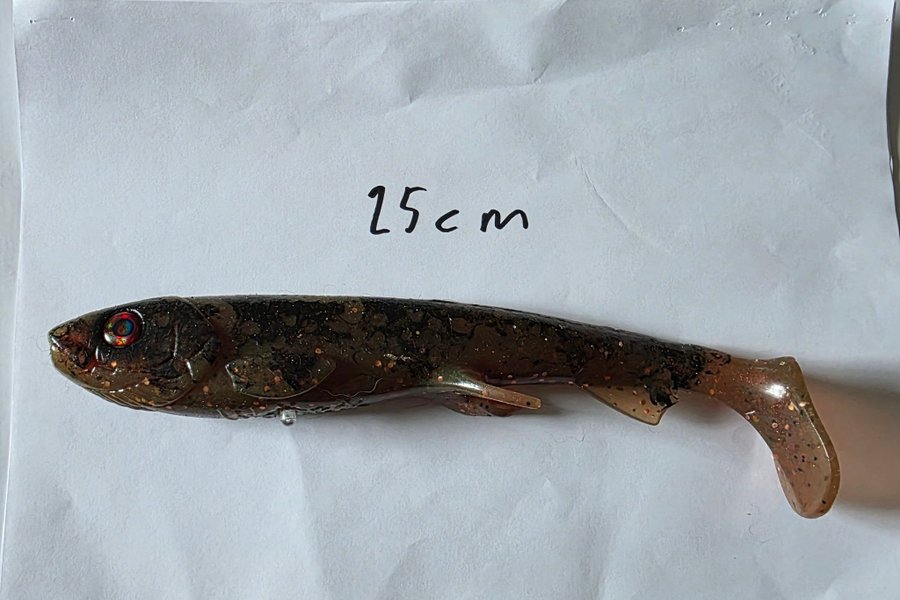 Wolfcreek handgjuten och handmålad i en längd av 25 cm. Passar för fiske och kan användas i olika vattenmiljöer.